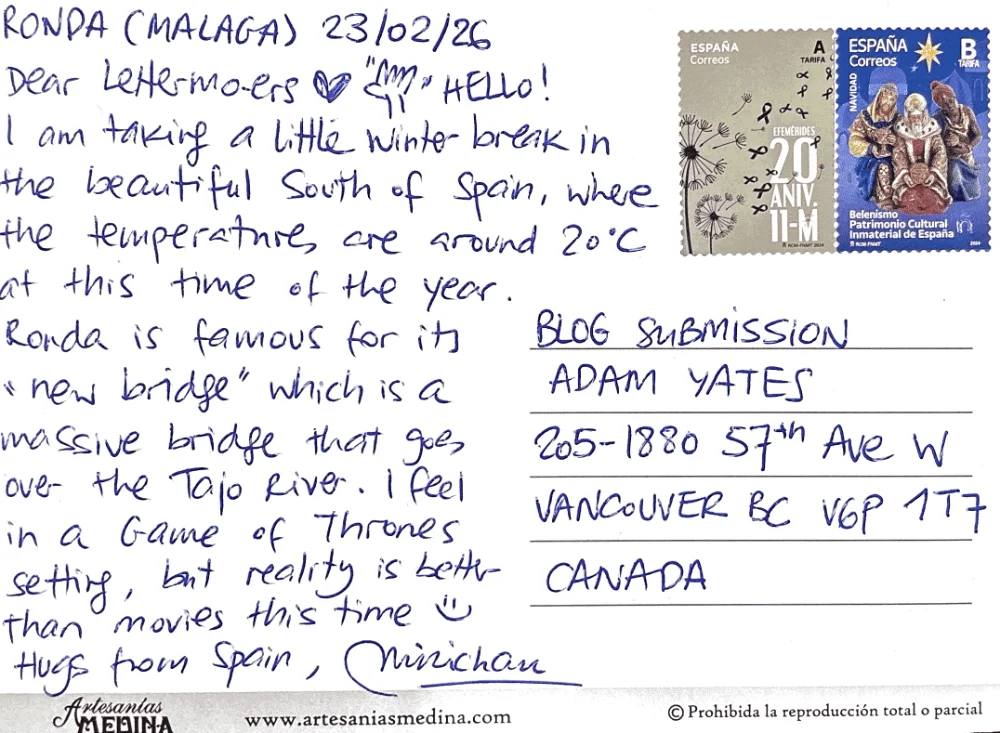 Our latest mail-in entry to the LetterMo blog comes from our LetterMo treasurer, @mirichan, who writes in to the blog from her winter get-a-way to the south of Spain!