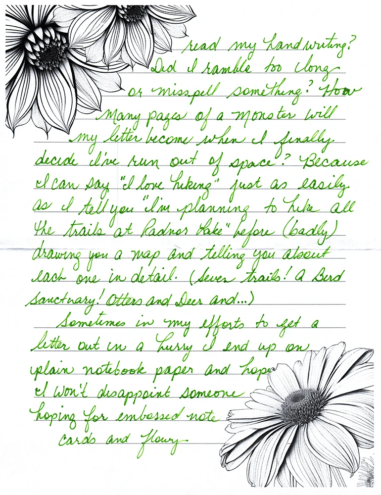 Then you (I) sit down and write. And nothing matters anymore. The world drops away and all that matters is the words. I’ll admit, I always worry about what I say. Can they read my handwriting? Did I ramble too long or misspell something? How many pages of a monster will my letter become when I finally decide I’ve run out of space? Because I can say “I love hiking” just as easily as I tell you “I’m planning to hike all the trails at Radnor Lake” before (badly) drawing you a map and telling you about each one in detail. (Seven trails! A Bird Sanctuary! Otters and Deer and…)