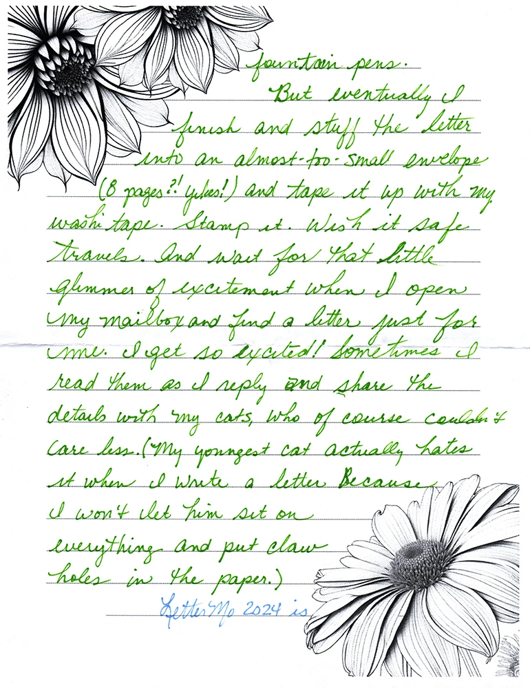 But eventually I finish and stuff the letter into an almost-too-small envelope (8 pages?! Yikes!) and tape it up with my washi tape. Stamp it. Wish it safe travels. And wait for that little glimmer or excitement when I open my mailbox and find a letter just for me. I get so excited! Sometimes I read them as I reply and share the details with my cats, who of course couldn’t care less. (My youngest cat actually hates it when I write a letter because I won’t let him sit on everything and put claw holes in the paper.)