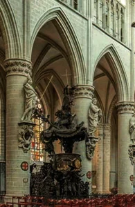 The image on the postcard is pulpit in the St. Gudula and St. Michael Church, Brussel (capital).