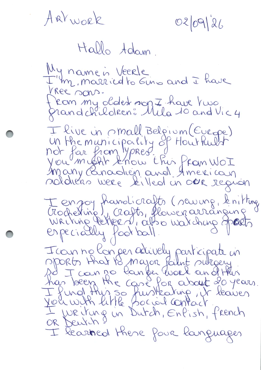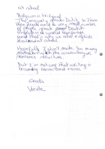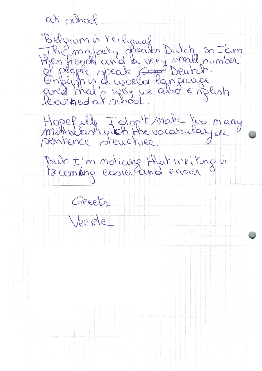 I write in Dutch, English, French, or Deutch. I learned these four languages at school. Belgium is trilingual. The majority speaks Dutch, as I am, then French, and a very small number of people speak Deutch. English is a world language and that’s why we also teach English at school.